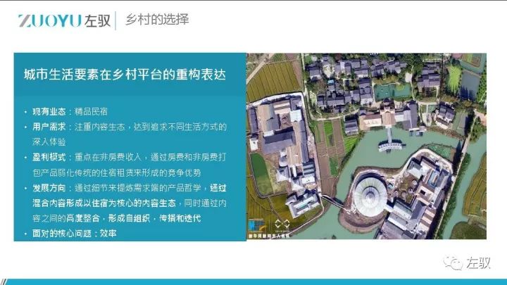 在乡村的方向上,精品住宿由于效率不如城市,所以规模化发展遇到一定的障碍。除了提供住宿外,还应创造整个区域内消费的多元性,融入大平台,建立小生态。比如乌镇的乌村,本质是以度假村为主题的精品住宿小型综合体业态,思路是靠着乌镇大的区域,做独立的生态系统。住宿只是其中的一个环节,核心是提供整体化的服务,除了住宿还有会展等其他收入,即创立生态,提高收入。