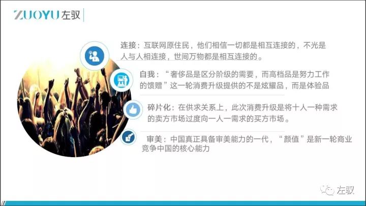 3). 碎片化,千禧一代人由于受到了信息的冲击,所有的行为都呈现碎片化特点,不管是接触的信息还是渠道。这次的消费升级,实际上是把十人一种的需求,过渡到一人一种的需求。