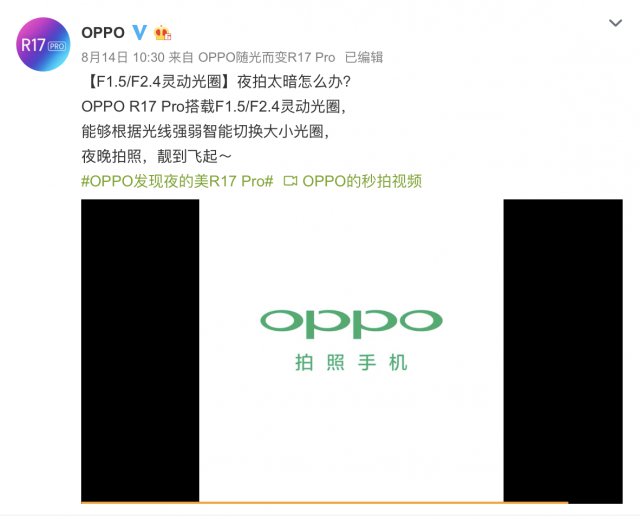 8 月 12 日晚上,OPPO 在微博放出了一段视频,视频最后的文字是「发现夜的美」,暗示 R17 系列可能会主打夜拍。紧接着,8 月 14 日上午,OPPO 就公布了为何主打夜拍—— R17 Pro 将采用「F1.5/F2.4 灵动光圈」。