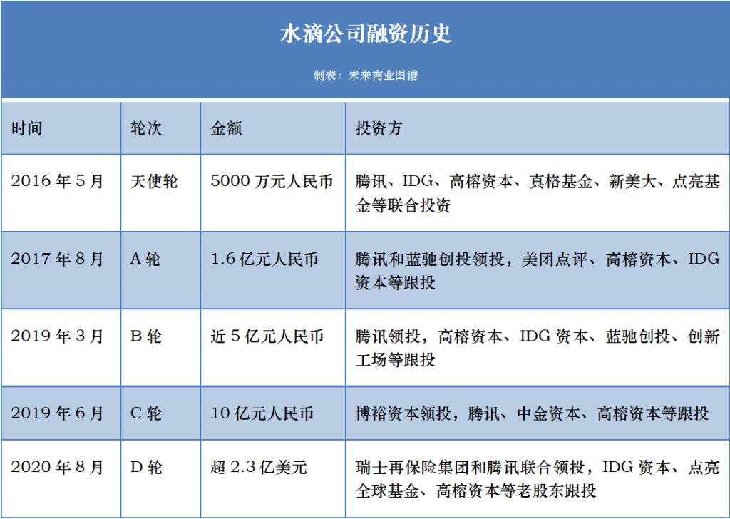 随后,水滴公司于 8 月 20 日宣布完成超 2.3 亿美元 D 轮融资,由瑞士再保险集团和腾讯联合领投,IDG 资本、点亮全球基金、高榕资本等老股东跟投。有消息称,本轮融资后水滴公司估值达到 40~60 亿美元。