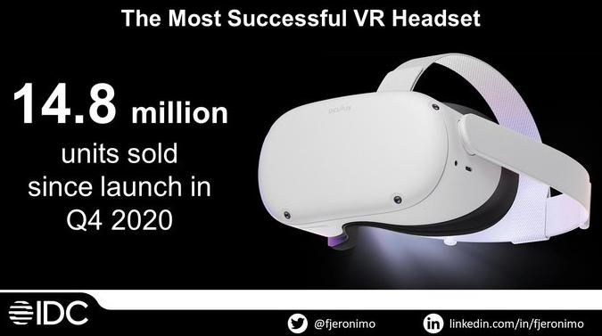 Meta Quest 是 Meta 旗下的 VR 头显设备品牌。这个以亲民售价打通消费者市场的一体机品牌商业成绩喜人,根据数据分析公司 IDC 的报告,自 2020 年 10 月发售以来,Meta Quest 2 的销量已达 1480 万台,作为对比,PS5 发售一年半的销量在 2100 万台左右。不难看出,曾经那个销量寡淡的 VR 设备行业,如今已有追赶传统游戏主机市场的趋势。