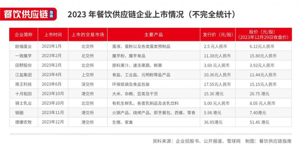 从股价走势来看,过去一年,新登陆资本市场的供应链企业,大部分企业股价都高于发行价。截至 2023 年 12 月 29 日收盘,包括十月稻田、欧福蛋业、锅圈、一致魔芋在内的 8 家企业的股价都高于当初的发行价。南王科技的收盘价则跌至发行价之下。