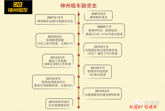 神州租车成立于2007年,是一家汽车租赁服务提供商,其业务线目前包括租车、二手车和专车。在2010年9月15日,联想控股以“股权+债权”形式,向神州租车注资合计12亿元,持股超过51%。在经历了颇为曲折的发展之后,神州租车在2013年开始盈利,2014年9月又再次冲击IPO,终于在港交所上市,成为国内汽车租赁行业的首个上市公司。下图为钛媒体整理的神州租车融资史。