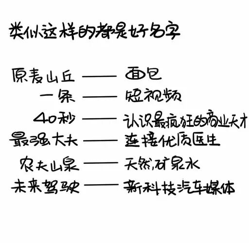 一些好的品牌名让人朗朗上口。原麦山丘(面包)、一条(短视频)、40秒(认识最疯狂的商业天才)、最强大夫(连接优质医生)、农夫山泉(天然矿泉水)、未来驾驶(新科技汽车媒体),这些都是好名字。