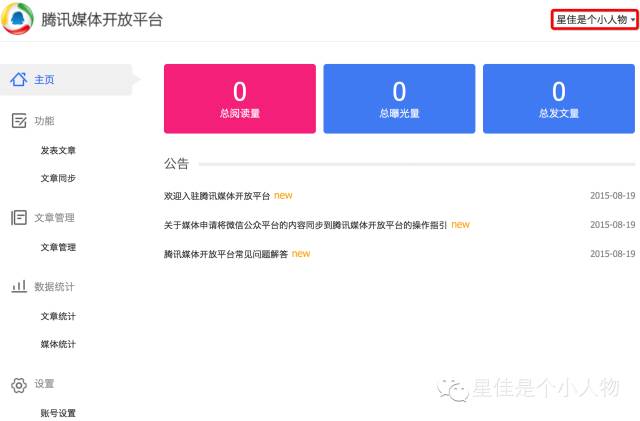 目前后台的功能依然很简单,甚至跟微信公众平台同步文章的功能还在开发中,只有最简单的【发文章】【数据统计】等基础功能,不过相信在坚持贡献优质内容后,就跟当年星佳享受到的今日头条“头条号”的红利一样,做的早总比做的晚的吃香嘛。