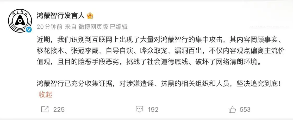11月27日 针对近期网络上密集出现的负面舆情,鸿蒙智行方面于今日上午正式发布公告进行回应。