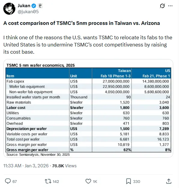 1月4日讯 台积电等半导体制造商纷纷在美设厂的重要原因在于规避地缘政治风险,但它们也不得不接受运营成本上升带来的挑战。
