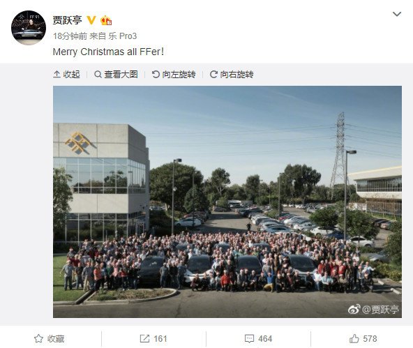 今天,贾跃亭在微博上晒出了一张法拉第未来的全家福照片,照片中,数百 FF 员工头戴圣诞帽庆祝节日,拥围 7 辆 FF91 电动车,齐聚一堂,看起来活力十足。