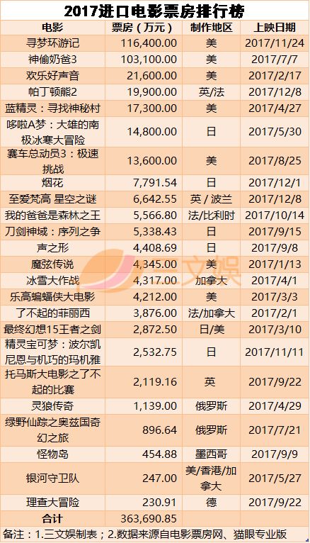 再来看进口动画电影,2017年的票房为36.37亿元,占据了国内电影票房的7成,仅《寻梦环游记》就贡献了23.32%的票房。