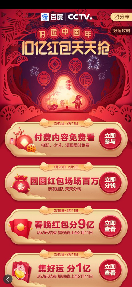 最后还是要提醒大家,一定要及时提现,否则过期之后春晚就白忙活了,基本上最后的提现时间也就是法定休息日结束之时。同时,2 月 19 日,《央视元宵晚会》百度会再次发放 2 亿红包,感兴趣的用户可以准备抢本次的元宵红包。