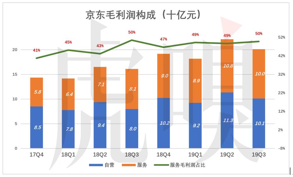 假设自营业务毛利润率 8.5%(未扣除履约成本),则 2019 年 Q3 服务收入贡献的毛利润刚好达到 50%。