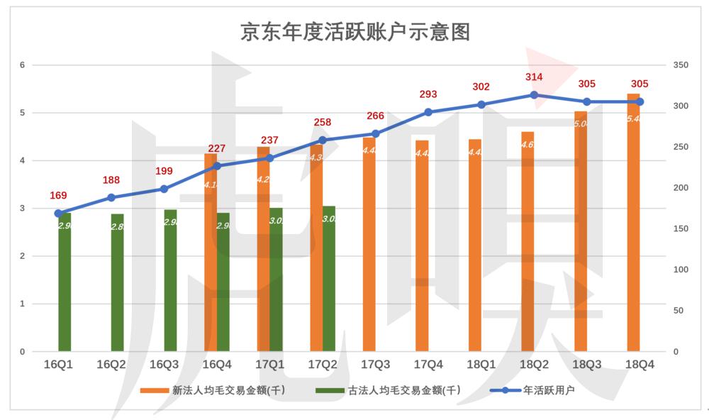 进入 2018 年,京东年度活跃账户(过往 12 个月内下过至少一次订单)增速放缓,年末 3.05 亿,仅比一季度末增加 350 万户。户均每年毛交易金额(过往 12 个月 GMV 除以年度活跃账户数)较一季度增长 950 元。