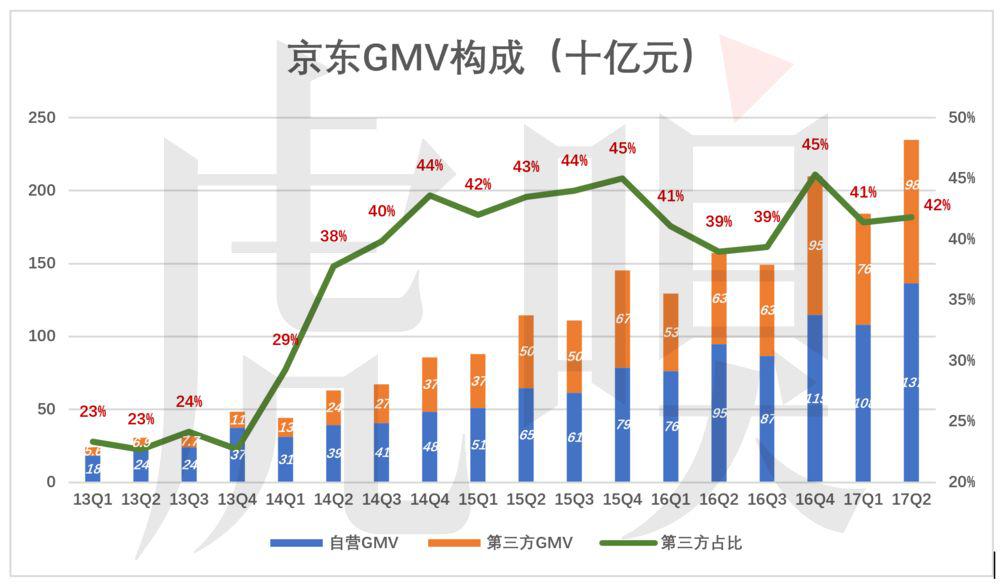 到 2017 年 Q2,自营 GMV、第三方 GMV 分别为 1366 亿和 982 亿,第三方 GMV 占比 42%。