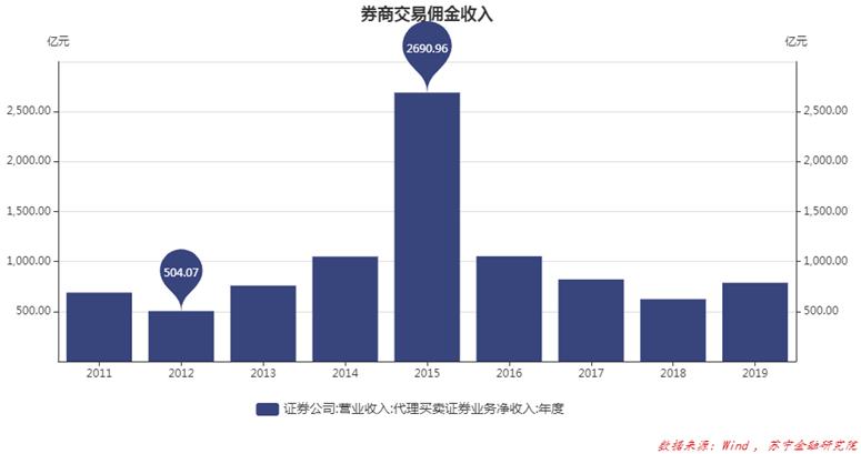 2015 年埋藏了很多散户的痛苦回忆,杠杆牛转熊、指数连续跌停、基金 B 下折、爆仓、熔断,一桩桩、一件件,据说毁了很多中产。但券商作为卖水客,赚得盆满钵满,当年交易佣金收入是 2690 亿元。