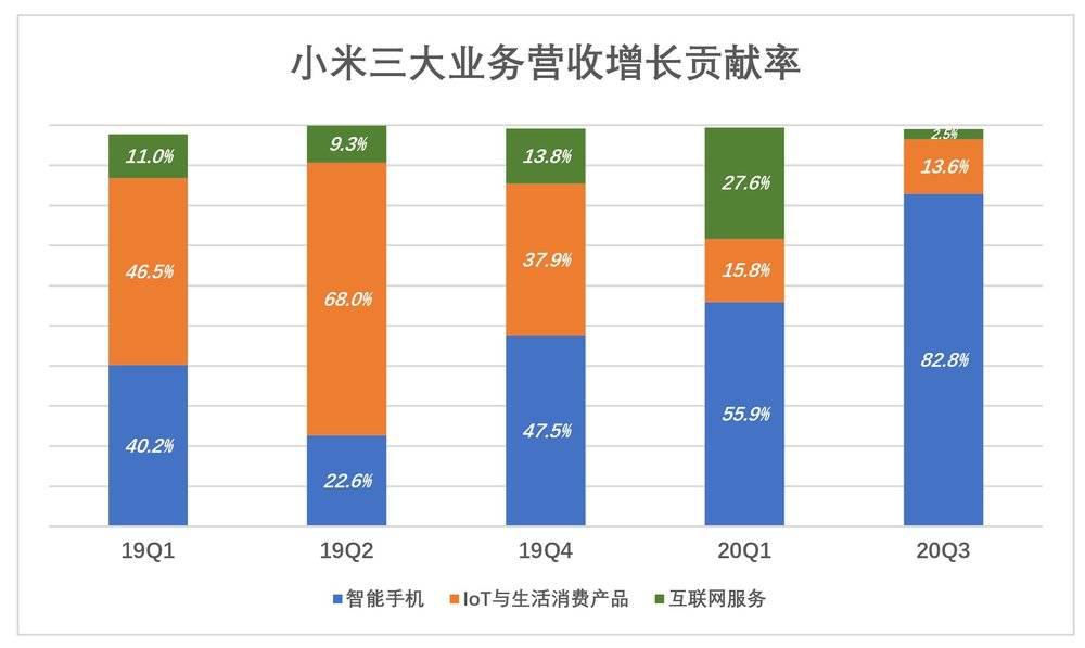 2019 年 Q2,手机销售收入 320 亿、同比增长 5%,对小米营收增长的贡献率仅为 22.6%;2019 年 Q4、2020 年 Q1,手机销售对营收增长的贡献率分别为 47.5%、55.9%;2020 年 Q3,手机销售对营收增长的贡献率达到 82.8%。