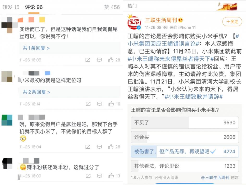 因此,在三联发起的投票 " 王嵋的言论是否会影响你购买小米手机 " 下,占比最多的选项是 " 不买了。" 事实上,最让米粉寒心的是,正如一个米粉所说:" 她敢公开这么说,说明公司内部文化就是这样。" ——内里是公司并没有尊重赖以起家的 " 低端市场用户 ",而是一边鄙视小米用户,一边收割韭菜。