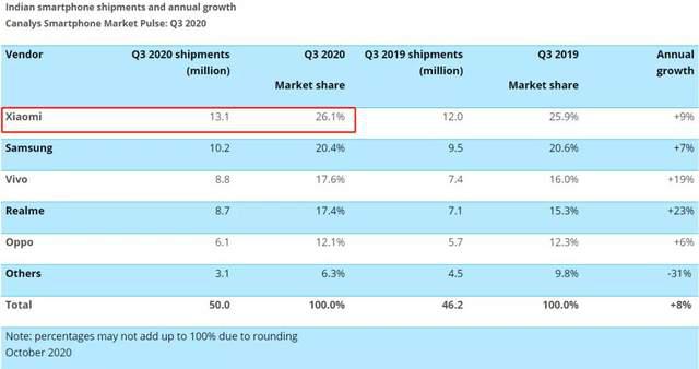 尽管印度有着反华情绪,但 2020 年第三季度的印度手机出货量已经说明了一切,光是小米一个品牌就达到了 1310 万台。。。