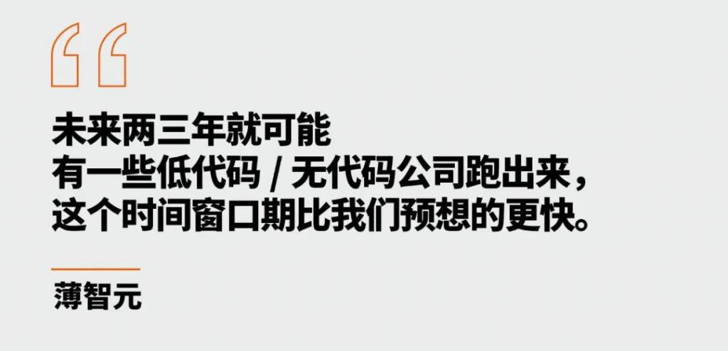 目前,国内低代码 / 无代码整体市场规模已经近 20 亿,未来五年复合增长率将达到 49.5%。可见,整个市场已经进入到快速上升通道。" 未来两三年就可能有一些公司跑出来,这个时间窗口期比我们预想的更快。"薄智元说。