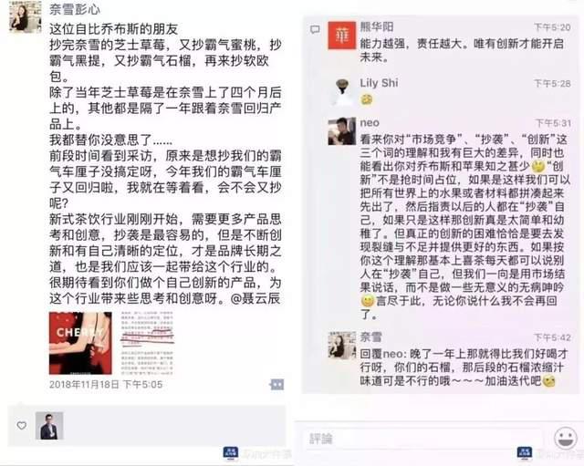 2018 年 11 月,奈雪的茶创始人在朋友圈公开点名喜茶抄袭:" 新式茶饮业刚刚开始,需要更多的产品思考与产品创意,抄袭是最容易的,但是不断创新和有自己的清晰的定位才是品牌企业的长久之道。"