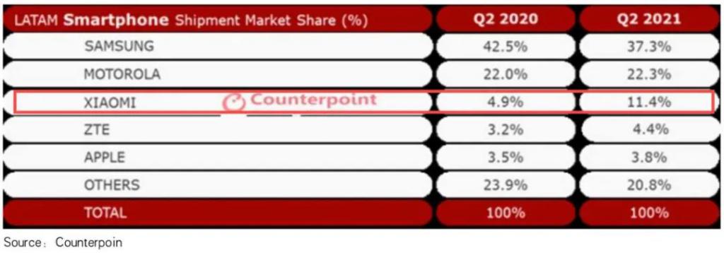 2019 年,小米开始加快推进拉美市场,而随着 LG 退出手机市场和三星供货受阻,其空出的市场份额被小米顺利承接,小米市占率得以自 2020Q2 的 4.9% 增长到目前的 11.4%。