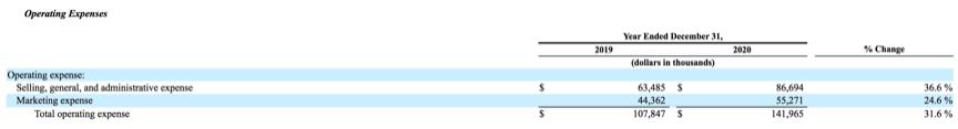 与 2019 年相比,Allbirds 在 2020 年的 SGA 支出增长了 36.6%,主要支出来源为员工人数及门店的新增,包括人工相关成本增加了 1380 万美元,门店折旧摊销费用增加了 370 万美元,门店租金增加 250 万美元。