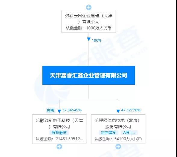 天眼查信息显示,乐视网目前持有乐融致新电子科技(天津)有限公司 25% 的股权,而乐融致新的第一大股东则是天津嘉睿汇鑫企业管理有限公司,此前该公司为孙宏斌入股乐视网、乐融致新等公司时的主体。