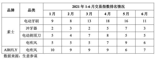 招股书显示,2021 年 6 月,素士电动牙刷在天猫平台的交易指数排名第 11、冲牙器排名第 3、电动剃须刀排名第 5、电吹风排名第 6。