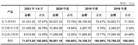 经过 20 年发展,宝立食品已形成 " 复合调味料、轻烹解决方案和饮品甜点配料 " 三大主营业务,2021 年上半年,占营业收入的比例分别为 57.67%、29.78%、12.55%。可以看到复合调味料收入占比虽然有所下降,但仍然是公司的基本盘;而随着料理包在国内的风行,轻烹饪业务收入占比快速上升,由 2018 年度的 3.32%,上升至目前的 29.78%。