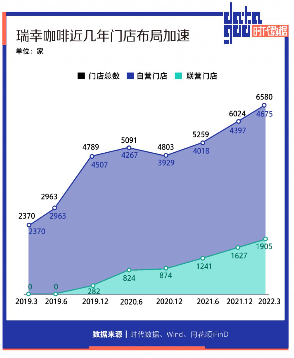 2021 年,瑞幸咖啡在专注于直营模式的同时,加大了对加盟商的招揽力度。正因如此,2021 年第四季度净新增 353 家门店,截至 2022 年 3 月 31 日,门店总数已达到 6580 家,其中自营门店 4675 家,联营门店 1905 家,其门店总数量已经超过星巴克在中国的 5557 家门店。