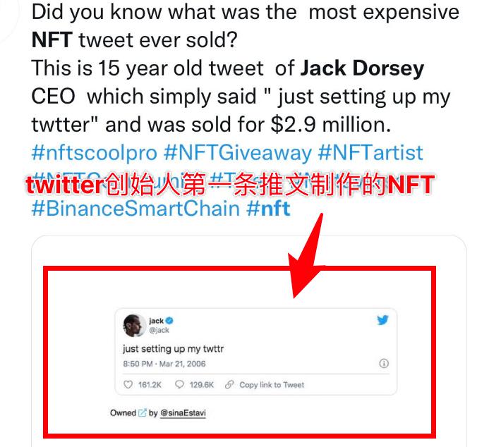 去年,推特联合创始人杰克 · 多西「第一条推特」制作而成的 NFT 图文,被以 291w 美元(约合人民币 1958w 元)的价格拍下。