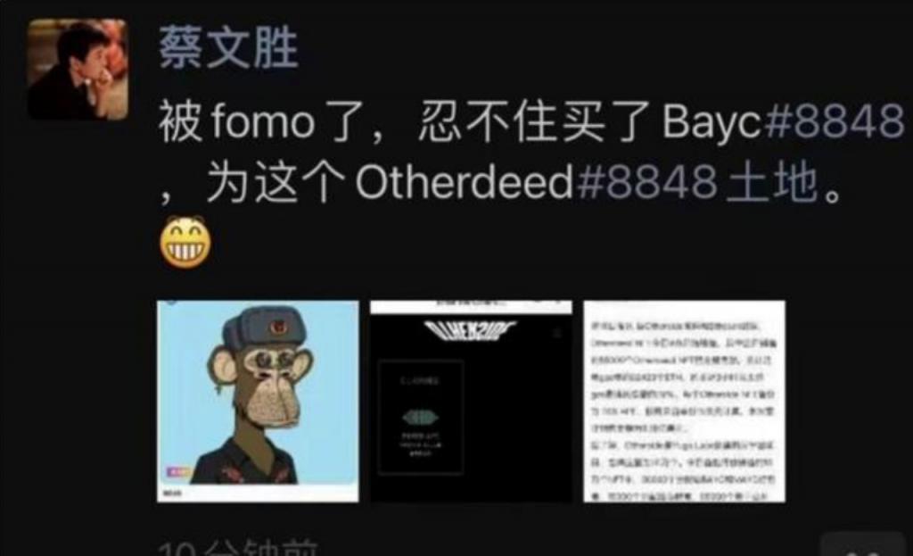 在朋友圈,蔡文胜还无奈地表示自己 FOMO(fear of missing out),因为害怕错失而购买了这个 NFT,可见在名人圈子中,NFT 成为一个大家都想入局的 " 香饽饽 "。