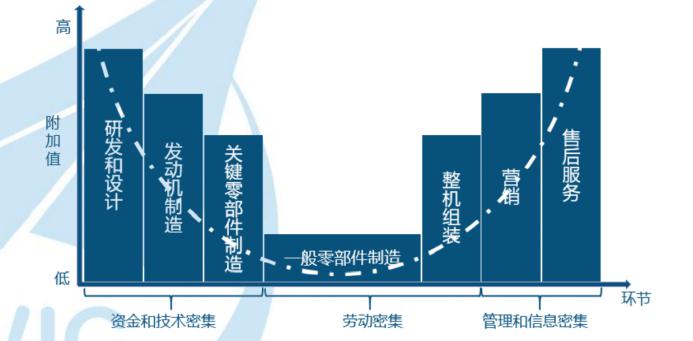 从价值分配的角度来看,大飞机产业链的价值分布呈 " 微笑曲线 " 状。位于前端的研发设计与后端的运营服务附加值最高;中段的飞机制造环节,发动机、关键零部件、航空材料高端制造同样有不错的附加值,而一般零部件制造和飞机组装的价值量则最低。