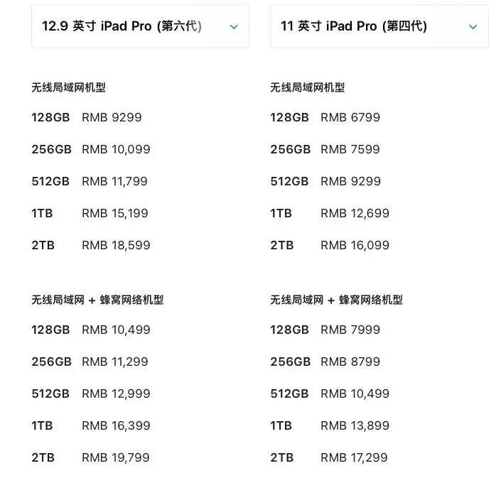 另外,两款 iPad Pro 的运行内存也跟容量相关,在 128GB、256GB、512GB 容量的机型中,配备的是 8GB 运存,而在 1TB 和 2TB 高配容量的机型中,则是 16GB 运存。