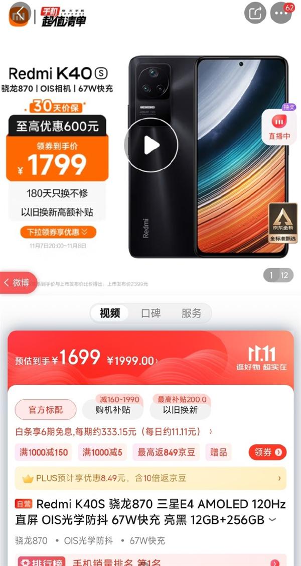 日前我们刚刚报道过,今年新推出的骁龙 870 旗舰 Redmi K40S 的 12GB+256GB 顶配版本到手价低至 1799 元。