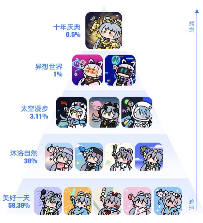 每套藏品都具有稀有值,诚如 " 干杯!洛天依 " 联名款原创数字藏品头像打造了 " 美好一天 "" 沐浴自然 "" 太空漫步 "" 异想世界 "" 十年庆典 " 五个主题,其稀有值各不相同,分别是 59.39%、36%、3.11%、1%、0.5%。" 粗略估计,如果出现稀有藏品,投资翻个倍也是可能的。"