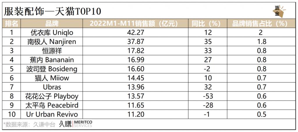 从品牌维度来看,天猫平台中,优衣库和南极人表现亮眼,排名第1、第2;蕉内凭借内衣、家居服类目的深度耕耘和对于成衣的拓展,持续高速增长。