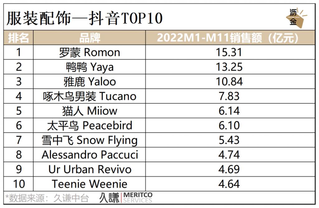 抖音平台中,罗蒙、鸭鸭、雅鹿位列前3,国产品牌普遍发展势头良好。