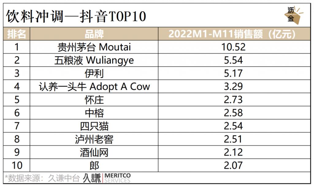 抖音平台中,贵州茅台、五粮液和伊利牢牢占据前3,品牌优势明显;认养一头牛位于伊利之下,发展潜力大。
