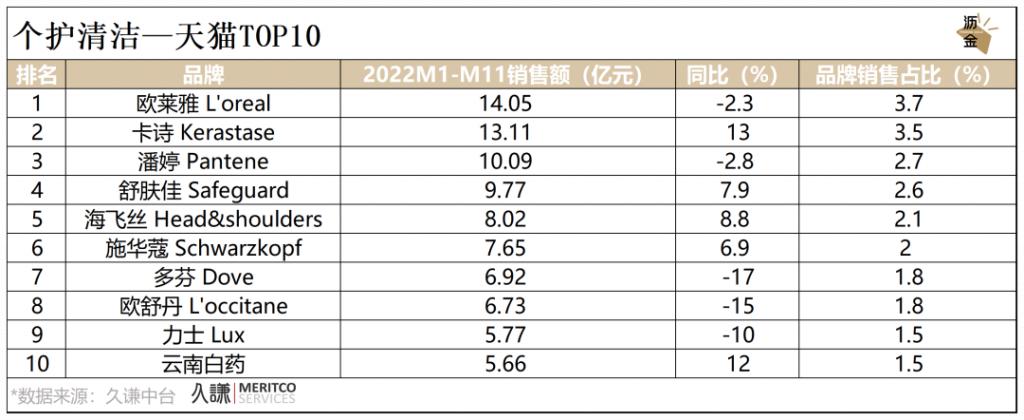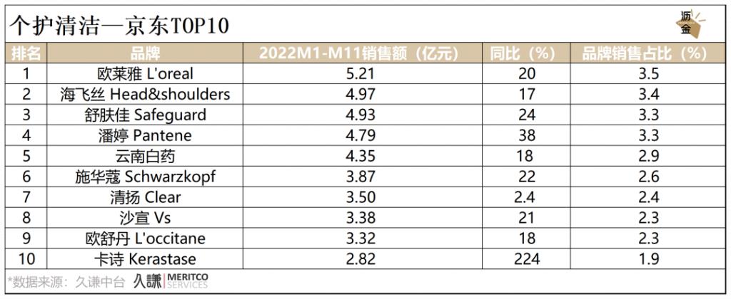 京东平台中,海飞丝和舒肤佳紧随欧莱雅之后,大有赶超之势;值得注意的是,卡诗呈爆发式增长,跻身前10。