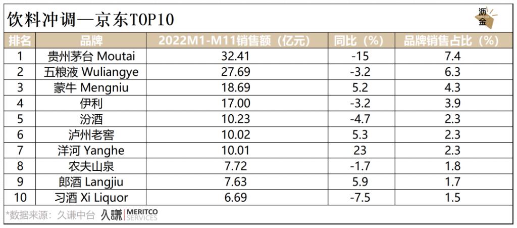 京东平台中,贵州茅台和五粮液排名前2,稳居酒类龙头地位,但增速下降。