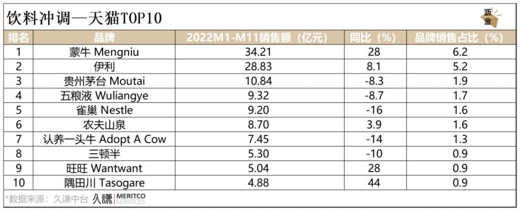 从品牌维度来看,天猫平台中,乳制品表现较佳,蒙牛、伊利分别排名第1、第2;隅田川发展势头良好,同比增长44%。