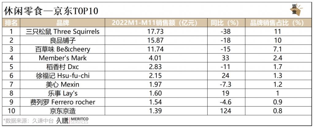 京东平台中,良品铺子位于百草味之上,京东京造销售额呈爆发式增长,跻身前10。