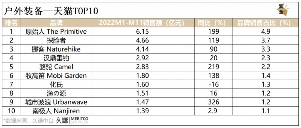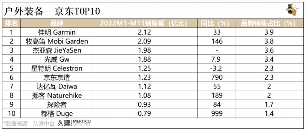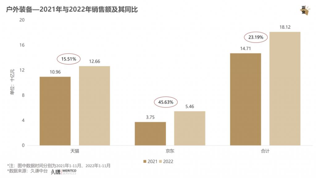 2022年,户外装备大盘销售同比大幅增长,其中京东的上涨幅度约是天猫的3倍。