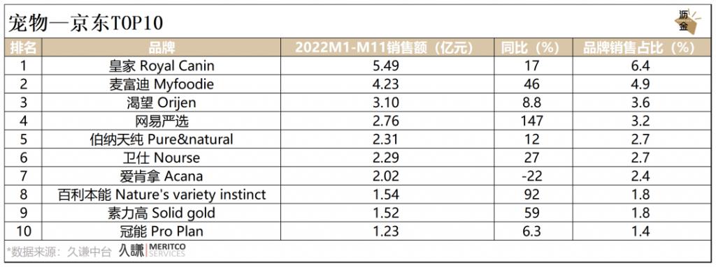 京东平台中,皇家位于麦富迪之上,荣登销售榜第1;网易严选同样呈高速增长,表现突出;百利本能、素力高增速较快,排名第8、第9。