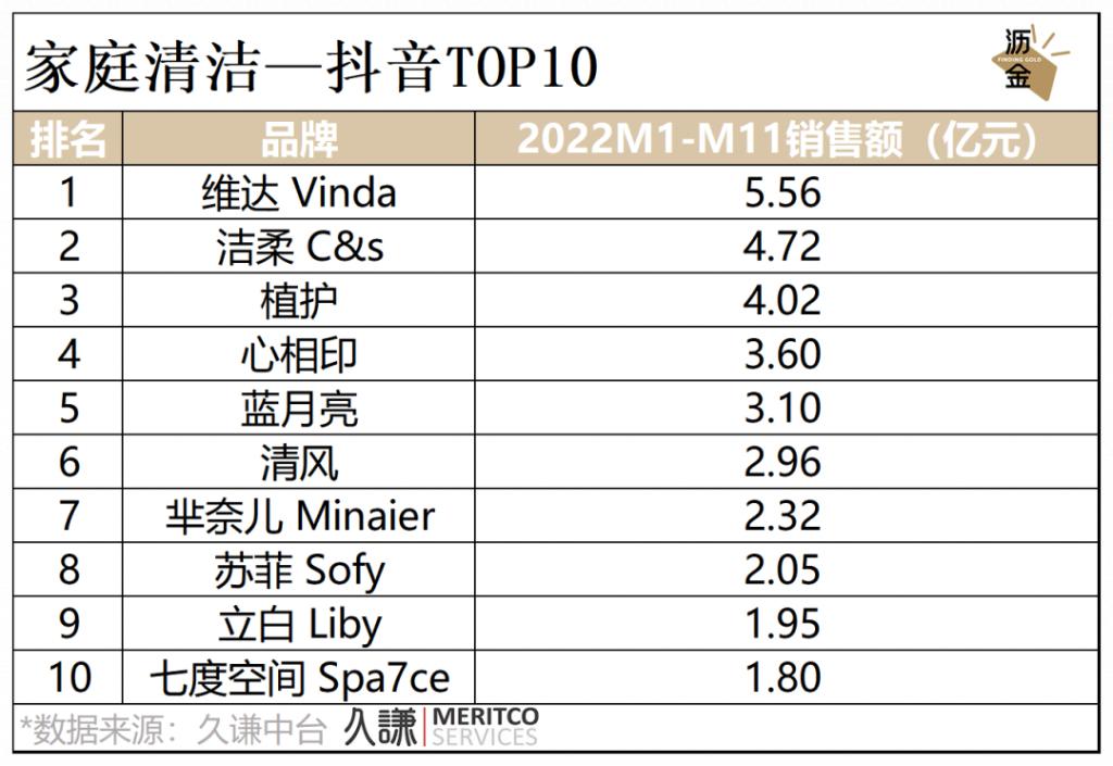 抖音平台中,维达和洁柔排名前2,植护由于店铺直播和达人带货表现优异,排名第3。