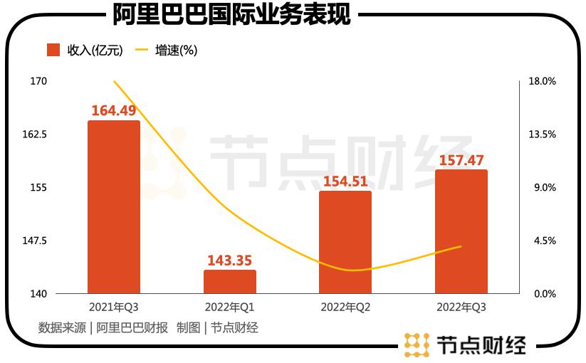 消费业务,阿里既要承受内需不振的压力,又要和拼多多、京东、抖音、美团、快手存量厮杀;全球化业务,由蒋凡挑头的海外市场,在与字节、腾讯同场竞技时显得非常吃劲,2021 年 Q4-2022 年 Q3 各季度,其国际商务(Lazada、速卖通、Trendyol、Daraz 及 Alibaba.com)收入同比分别增长了 18%、7%、2%、4%,减速严重,业务占比均在 7%-8% 之间。