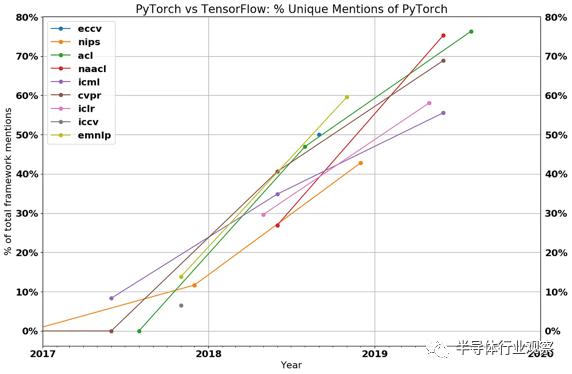 几年前,框架生态系统相当分散,但 TensorFlow 是领跑者。谷歌看起来准备控制机器学习行业。他们凭借最常用的框架 TensorFlow 以及通过设计 / 部署唯一成功的 AI 应用特定加速器 TPU 获得了先发优势。