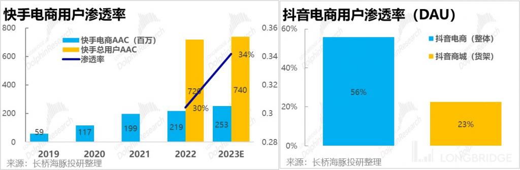首先从用户渗透率来看,据调研年活口径下快手电商用户的渗透率在 2022 年为 30%,相比之下抖音电商在日活口径下整体的用户渗透率已达 50% 以上,而货架电商模式的抖音商城渗透率也已超过 20%。可见抖音电商的当前的用户渗透率已相当高,显著领先于快手(应当也是抖音 GMV 总量远胜快手的主因)。因此,海豚君认为抖音通过提升电商用户体量快速拉升 GMV 规模的阶段已基本过去,快手则还有不少提升空间。