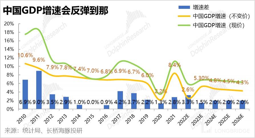 不过上述 GDP 增速预测都是基于价格不变的假设,因此包含通胀因素的名义 GDP 增长应当比上述预测高出 1%~3% 左右。