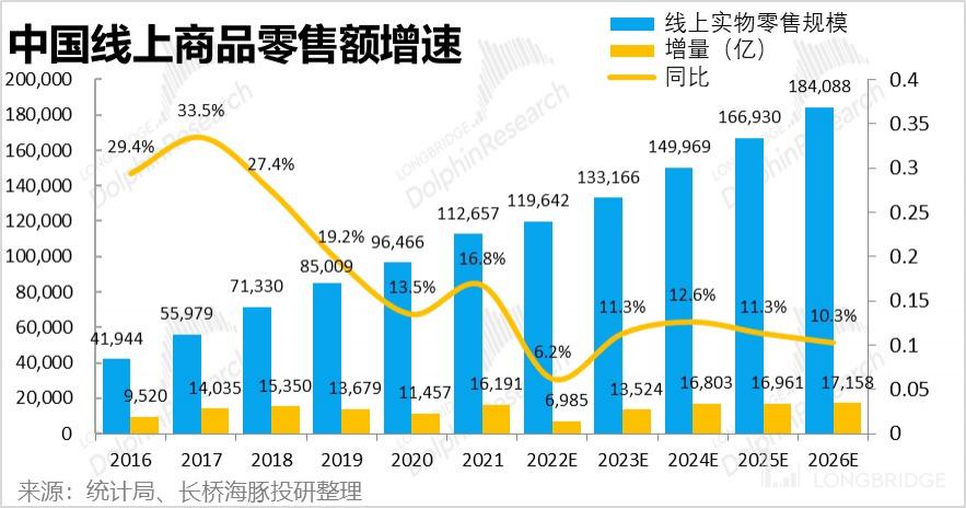 最终,海豚君测算出2023~2026 四年间线上实物零售的增速中枢为 11.4%,其中 2023 年为 11.3% 增速最低但仍略高于 2022 年。但出乎海豚君意料的是,即便我们预计线上零售增速在走出疫情后是呈 L 型(即增速企稳,但不会再度提速)。但从 2024 年开始每年线上零售规模的绝对增长实际会创出史上最高值。可见线上零售的蛋糕尚能做出相当可观的增量。